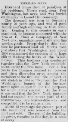 Father Eberhard passed away in 1897 and was buried at Laurel Hill Cemetery, next to little Max. I found this obituary attached to Eberhard Flues' FindaGrave page: